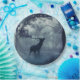 Placas de papel com foto de um veado real com galhadas em uma floresta sombria entre árvores iluminadas pelo sol. Neve caindo por toda parte.