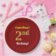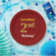 Este simples, personalizável, design de placa de papel com tema de aniversário apresenta uma mensagem personalizável, como "segundo aniversário do CustomName!", onde o nome pode ser alterado, e com o "segundo" com uma aparência falsa/imitada em forma de ouro. Ele também apresenta um fundo de cor vermelha. Chapas de papel como estas poderiam talvez ser usadas numa festa que está a ser realizada para celebrar o segundo aniversário de alguém. [~Z0000144]