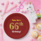 Este simples, personalizado, design de placa de papel com tema de aniversário apresenta uma mensagem personalizável, como "Name-Here's 66th Birthday!", onde o nome pode ser alterado, e com o "66º" com uma aparência falsa/de imitação em forma de ouro. Ele também apresenta um fundo de cor vermelha. Chapas de papel como estas poderiam talvez ser usadas numa festa que está a ser realizada para celebrar o sexagésimo sexto aniversário de alguém. [~Z0000144]