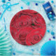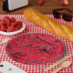 Vibrant, close up photograph of a bunch of red roses on party products and favors.