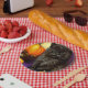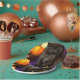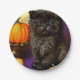 Placas de papel com um gatinho vintage do Halloween! Um gatinho preto fluffy posou perto de abóboras contra um fundo roxo. Um presente divertido para festas de Halloween e amantes de gatos!