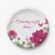Disposable party plate featuring lush pink flowers, green leaves, and soft butterflies. Ideal for birthdays, garden parties, baby showers, or spring events.