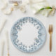 Estas placas de papel branco apresentam um manto azul e cinza inspirado na borda de arte folclórica sobre um fundo azul claro. O centro da placa é branco claro. Esse padrão seria perfeito para hospedar um chá de fraldas, mas é versátil para qualquer festa.