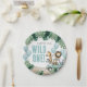 Add a fun, modern touch to your party table with these Wild One paper party plates designed for a first birthday celebration. The design features soft teal blue balloons for a cheerful, playful look, paired with the phrase Name Is A Wild One! The text is shown in a bold rustic teal blue font mixed with a clean gray sans serif for a fresh, modern feel. Space is included to personalize the child’s name.