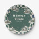 Complete your chic winter party setup with these coordinating Winter Village Paper Plates! The design features a dark forest green center with the sweet phrase 'It Takes a Village,' encircled by a charming border of snow-covered village houses, pine trees, and a stylish checkered flag trim in cream and deep blue/green.