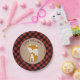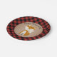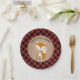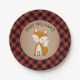 Placas de papel de chá de fraldas com ilustração de uma raposa bebê com fundo de xadrez de lenhador vermelho e preto.