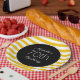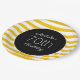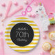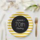 Chapas de papel para festa de aniversário feminina e feminina, desenhadas com tiras amarelas e brancas. O texto está sobre um fundo preto e é totalmente personalizável, portanto personalize essas placas de papelão para qualquer idade.