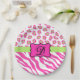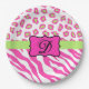 Faça uma festa de na moda e tendências com estas placas de papel personalizadas com o seu monograma inicial. As listras coloridas de zebra e as peles de leopardo ou de chita para design gráfico são uma das tendências mais quentes da arte e da design, e farão um tema atraente para as festas. Esta fofoca rosa-rosa, divertida e na moda, e padrão de impressão zebra e leopardo estão disponíveis em várias combinações de cores. Um emblema cor-de-rosa quente fuchsia em uma faixa de verde limão cria uma área de personalização com seu monograma inicial, nome ou outras palavras. Isso é totalmente personalizável.
