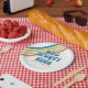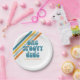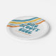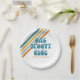 Placas de Festa de aniversário Groovy One Retro Style com faixas amarelas, laranja e azuis.