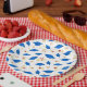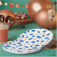 Pratos de papel para festa mostrados com uma celebração de estampa de gorros de formatura.
