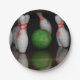 Pratos de papel com uma foto de pinos de boliche e uma bola de boliche.