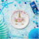 Pratos de papel de unicórnio com adorável rosto de unicórnio com cílios e chifre dourados em um lindo fundo floral rosa e bolinhas. Estes adoráveis pratos de papel de unicórnio são facilmente personalizados com o texto de sua escolha, e você pode adicionar uma cor de fundo e remover os pontos.