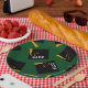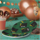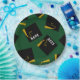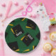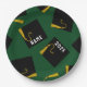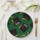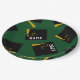 Pratos de festa de formatura verde criativos com detalhes de gorros de formatura pretos e dourados. Para personalizar, edite o texto para adicionar o nome do formando e o ano da turma de formandos.