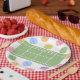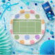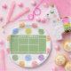 Pratos criativos com tema de festa ou evento de tênis com arte de quadra de tênis e padrão de bolas de tênis coloridas. Para personalizar, edite o texto.
