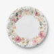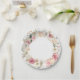 Este prato de papel temático da primavera tem bordas de grinalda de flores cor-de-rosa e brancas ao longo da borda em um fundo branco brilhante.