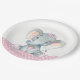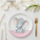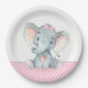 Pratos de papel para chá de bebê de elefante bebê fofos com adorável elefante bebê menina usando um laço rosa fofo em um fundo de bolinhas rosa e cinza. Você pode adicionar texto para personalizar esses pratos de papel para chá de bebê de elefante menina doce.