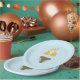 Maiô de duas peças verde e dourado em um prato de papel. Perfeito para a sua festa de piscina.