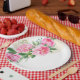Este prato de papel é mostrado com uma linda estampa de peônias rosa.