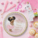 Pratos de papel para chá de bebê da princesa com linda princesa negra bebê menina com adorável cabelo afro usando tutu e colar de pérolas em um fundo rosa e dourado. Estes adoráveis pratos de papel para chá de bebê da princesa bailarina podem ser personalizados com texto no estilo de fonte e cor de sua escolha.