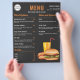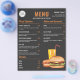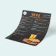 Modelo de lista de preços de cardápio de comida projetado para um restaurante ou vendedor de comida de rua com ilustração de Destei de alguns fast foods, incluindo uma bebida laranja com canudo vermelho, um cachorro-quente com ketchup e mostarda em cima e um hambúrguer que tem um pão com sementes de gergelim recheado com queijo, alface, carne, tomate, ketchup e picles. Há várias áreas de texto personalizáveis para listar diferentes tipos de refeições e outras opções de menu. No topo, há até um espaço para um logotipo personalizado. A cor do fundo é cinza muito escuro, quase preto. Personalize este design para atender às necessidades da sua empresa.