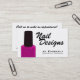 Começos bem sucedidos de um negócio com cartões de visitas surpreendentes! É você um técnico do prego? Estes cartões podem ser personalizados com seus nome e número de telefone! Se você gostaria de mudar ou adicionar alguma outra informação neste cartão, tal como o "prego projeta" o logotipo ou sua imprensa do endereço "personaliza-o" botão e muda-o como necessário. Características de design uma garrafa cor-de-rosa do polimento de unha com um fundo branco limpo e da sala para sua informação pessoal.
