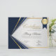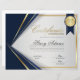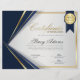 Certificado profissional de design de prêmio de de excelência apresenta cores azuis, douradas e cinzas com linhas detalhadas e borda dourada. Inclui prêmio de medalha de ouro e estrelas.