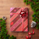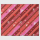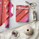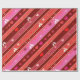 Papel de embrulho com um padrão listrado em tons rosas e vermelhos de fúcsia vivos, com pássaros e corações carinchosos.