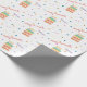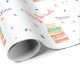 Colorido papel de embrulho de aniversário de toda a idade com gráficos divertidos de um bolo de aniversário caprichoso com velas e confete colorido como pontos. Feliz Aniversário em texto laranja está acima do bolo. O nome personalizado roxo está pronto para personalizar para atender às suas necessidades.