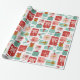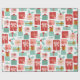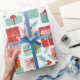 Este papel de embrulho apresenta os presentes de Natal acondicionados em plástico vermelho, rosa e azul-esverdeado.