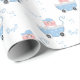 Este papel de envolvimento bonito do bebé caracteriza um bebé bonito em um chapéu azul e em um carrinho azul do carrinho de criança do polkadot cercados flutuando estrelas azuis com as palavras que é um menino!! Personalize este papel de envolvimento bonito do bebé com sua escolha do texto e da mensagem para uma grande surpresa do chá de fraldas!