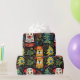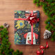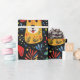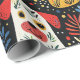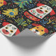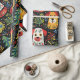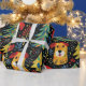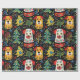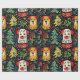 Cachorros bonitos aparecem por todo esse papel festivo de embrulho. São um prazer para o seu presente de Natal dar aos seus amigos e familiares amantes do cão. A design é da arte festiva e colorida do fauvismo e também uma pequena influência da arte popular. O fundo preto enfatiza a aparência colorida. Com as imagens de animais de estimação, árvores de Natal divertidas, verde e bagas imaginativas, folhas e outras partes decorativas da época de férias de inverno.