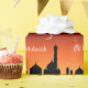 Ilustração do cumprimento de Eid com uma cena do céu da noite: silhueta de uma mesquita em um céu vermelho da noite.