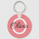Presente de chaveiro cor-de-rosa de coral monograma. Cadeia de teclas de botão redondo personalizado com a letra inicial do nome. Modelo de tipografia de script elegante.