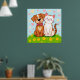 Uma ilustração alegre de um cão e um gato amigos sentados juntos no gramado verde cercado por flores coloridas e corações, simbolizando amizade e felicidade.