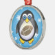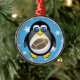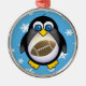 Pinguim engraçado com futebol em sua barriga no ornamento da árvore com fundo do floco de neve. Obtenha ornamento feitos sob encomenda do futebol da lembrança para cada membro de sua equipe ou para seu fan de futebol ou jogador favorito!