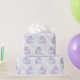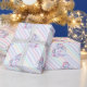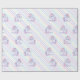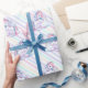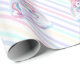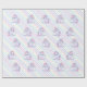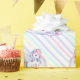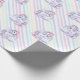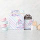 Enrolando papel em uma festa de aniversário mágica com um adorável unicórnio com asas nas nuvens sobre fundo arco-íris.