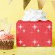 Este papel de embrulho tem vibrações retrógradas, apresentando um padrão de estrela de Natal com fundo vermelho. As estrelas são cor-de-rosa, creme, azul e rosa.