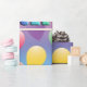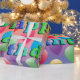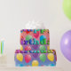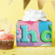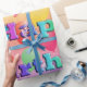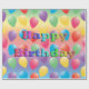 Balões coloridos sobre um fundo gradiente colorido com Happy Birthday em texto arco-íris.