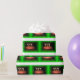 Uma foto de um Bolo de Aniversário com um quadro verde adicionado a ele que está em uma mesa. Em Sterling Kansas USA. É brilhante e colorido.
