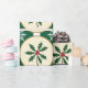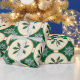 Este design de papel de embrulho apresenta um padrão festivo com imagens alternadas de folhas e bagas sagradas e flocos de neve brancos. As folhas e bagas ocas são representadas em círculos beges com contorno de ouro, colocados sobre um fundo verde-escuro. Os flocos de neve são intricadamente detalhados e colocados nos espaços entre os círculos, criando um design visualmente atraente e equilibrado com o tema de férias.