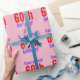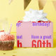 Este design de papel empacotado com tema de aniversário mínimo apresenta uma mensagem como "Tenha um excelente de 60 anos!", onde o número de aniversário pode ser personalizado. Um papel de embrulho como este pode ser usado para embrulhar presentes que estão sendo dados para celebrar o aniversário de alguém. Apresenta cores como rosa, roxo e vermelho.