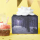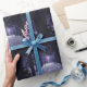Uma árvore de Natal cintilante numa floresta de pinheiros coberta de neve na noite de inverno.