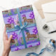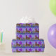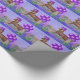 Cavalo com chapéu roxo e os balões roxos ao lado de uma cerca com um laço. Aniversário ou o outro papel de papel de embrulho da ocasião.