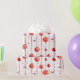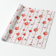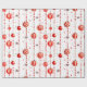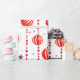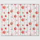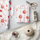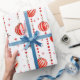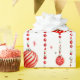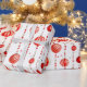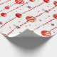 Este papel de embrulho apresenta um padrão repetitivo de Enfeites de natal vermelhos e brancos pendurados em cordas verticais de miçangas vermelhas. Há também pequenas estrelas vermelhas estilizadas espalhadas pelo fundo branco. Alguns ornamentos são vermelhos sólidos, enquanto outros têm listras vermelhas e brancas.