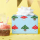 Um padrão de cartoons festivos cogumelos. Um tem boné como uma árvore de Natal e o outro tem boné como um chapéu de Papai Noel. O fundo é um azul claro e gelado.