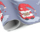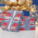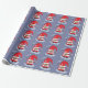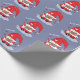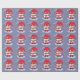 Um papel de embrulho de cinza azul com o padrão de um encantador gnomo de desenho vermelho. A palavra "Amor" também é escrita em letras grandes.