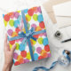 Metade da diversão de receber presentes de aniversário é desembaraçá-los com expectativa empolgada. Adicione à diversão com este papel brilhante e colorido de presente coberto por um padrão de arco-íris de balões translúcidos sobre fundo branco. Sombras de vermelho, cor-de-rosa, roxo, azul, verde, menta, amarelo e laranja irão apelar a todos e a todos no seu dia especial.