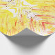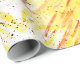 Papel colorido de embrulho de aniversário para festas de Natal com uma pintura de abstrato com aquarela que fiz com uma paleta de cor quente de amarelo, laranja e vermelho vibrante, além de alguns pontos brancos e pretos.