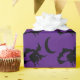A design de Diversão do Halloween apresenta a Bruxa Voadora e a silhueta da lua crescente sobre fundo roxo.