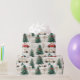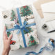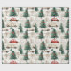 O papel de embrulho colorido mostra carros encantadores ao lado de árvores de Natal lindamente decoradas com arcos vibrantes, evocando um espírito alegre de inverno para dar presentes de Natal.